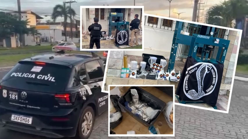 No imóvel, os policiais encontraram um laboratório de produção e refino de cocaína. Também foram apreendidas duas prensas hidráulicas, duas pistolas semiautomáticas, porções da droga, material para mistura, insumos químicos, além de dois veículos de luxo.