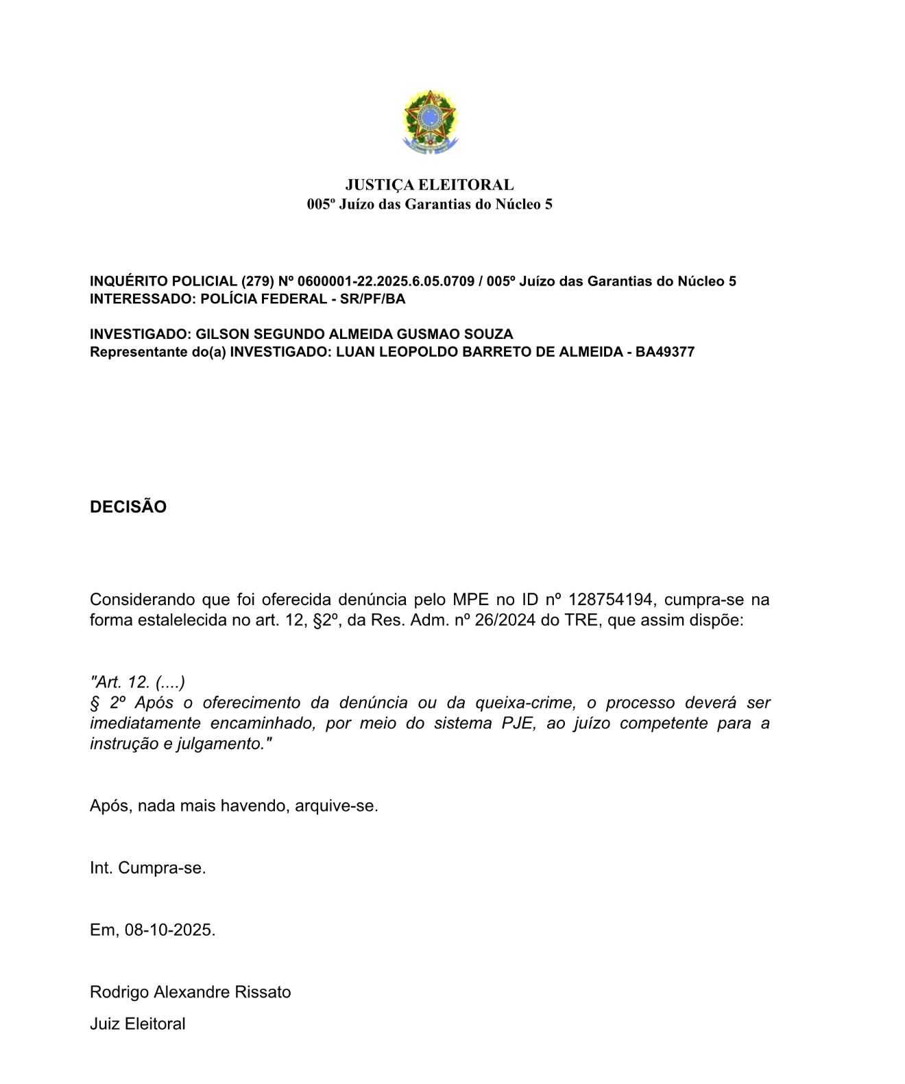 O caso tramita sob sigilo no Juízo Eleitoral da Comarca de Ubaíra e será analisado conforme os procedimentos estabelecidos pela Justiça Eleitoral. A denúncia foi formalizada no âmbito do Inquérito Policial nº 0600001-22.2025.6.05.0709, vinculado ao 5º Juízo das Garantias do Núcleo 5, com atuação da Polícia Federal na Bahia.