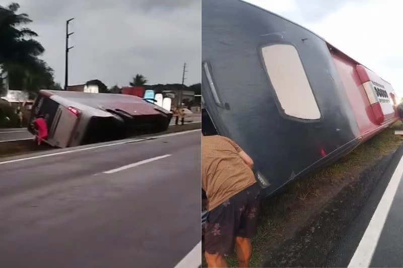 Um ônibus interestadual da empresa São Matheus tombou no canteiro central da BA-099, na Estrada do Coco, próximo de Barra do Jacuípe, no município de Camaçari, na manhã desta segunda-feira (07/07).