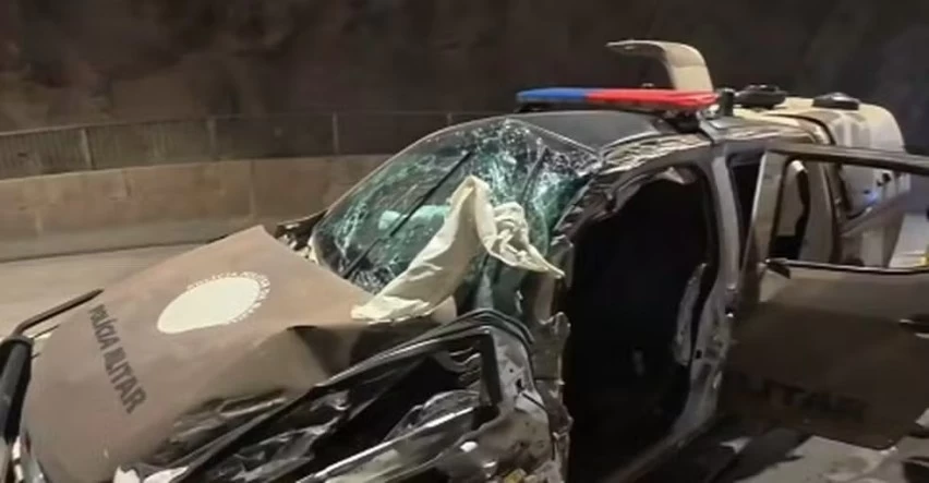 A viatura ficou completamente destruída após o impacto. De acordo com o coronel, os três policiais estão conscientes. Os outros dois militares sofreram ferimentos superficiais.