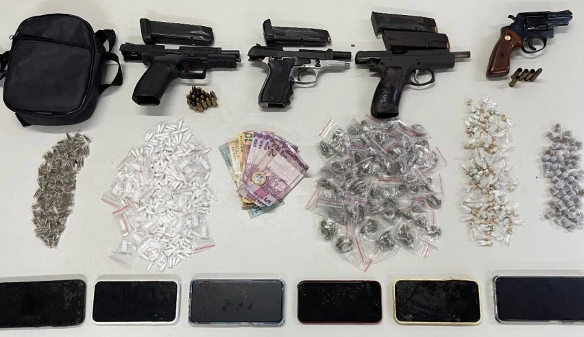 Na ação, foram apreendidos três pistolas de diferentes calibres, um revólver calibre .38, munições, seis celulares, 331 porções de cocaína, 182 porções de k9, 103 porções de crack, 64 porções de maconha e R$ 206 em espécie.