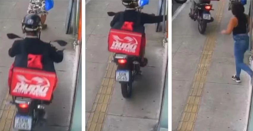 A ação foi registrada por câmeras de segurança de um estabelecimento vizinho. Nas imagens, um motociclista com mochila de entregador circula com a moto pela calçada e, em seguida, se aproxima da vítima, que estava parada na porta de uma loja. Ele estica o braço e toma o celular da mulher, fugindo logo depois.